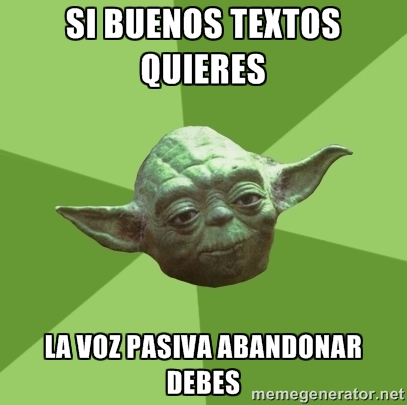 La voz pasiva debe ser erradicada de un blog. Suena antigua, suena raro y recuerda a una clase de Lengua de 3º de secundaria. Puede parecer que digo una tontería, pero todavía veo páginas web donde se usan y el resultado es nefasto. De hecho, yo sí lo veo salgo por donde he venido porque algo me empieza a oler raro.