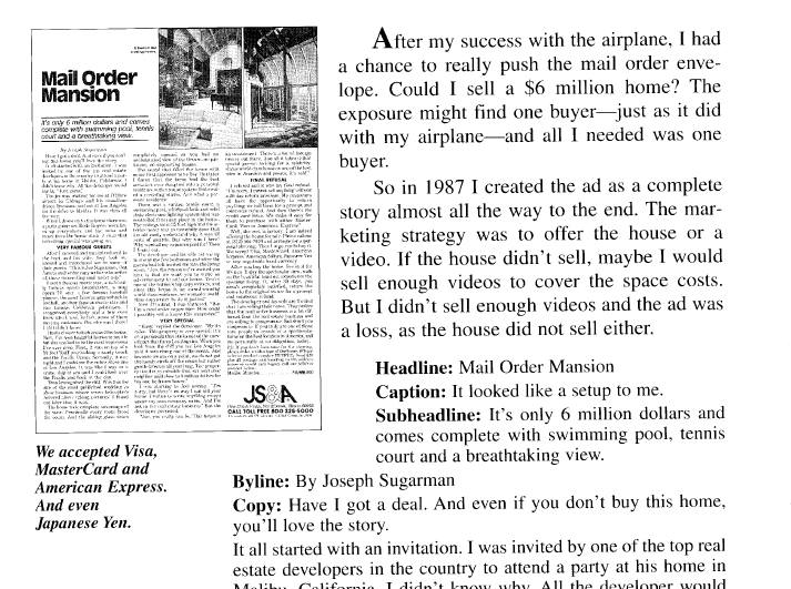 Joseph Sugarman fue capaz de vender un avión de su compañía a través de un anuncio de revista, por lo que se propuso vender una casa de la misma forma. Para hacerlo diseñó un anuncio bastante apañado para revistas y vendía un vídeo a 20$ de la propia casa, la cual valía 6 millones dólares.