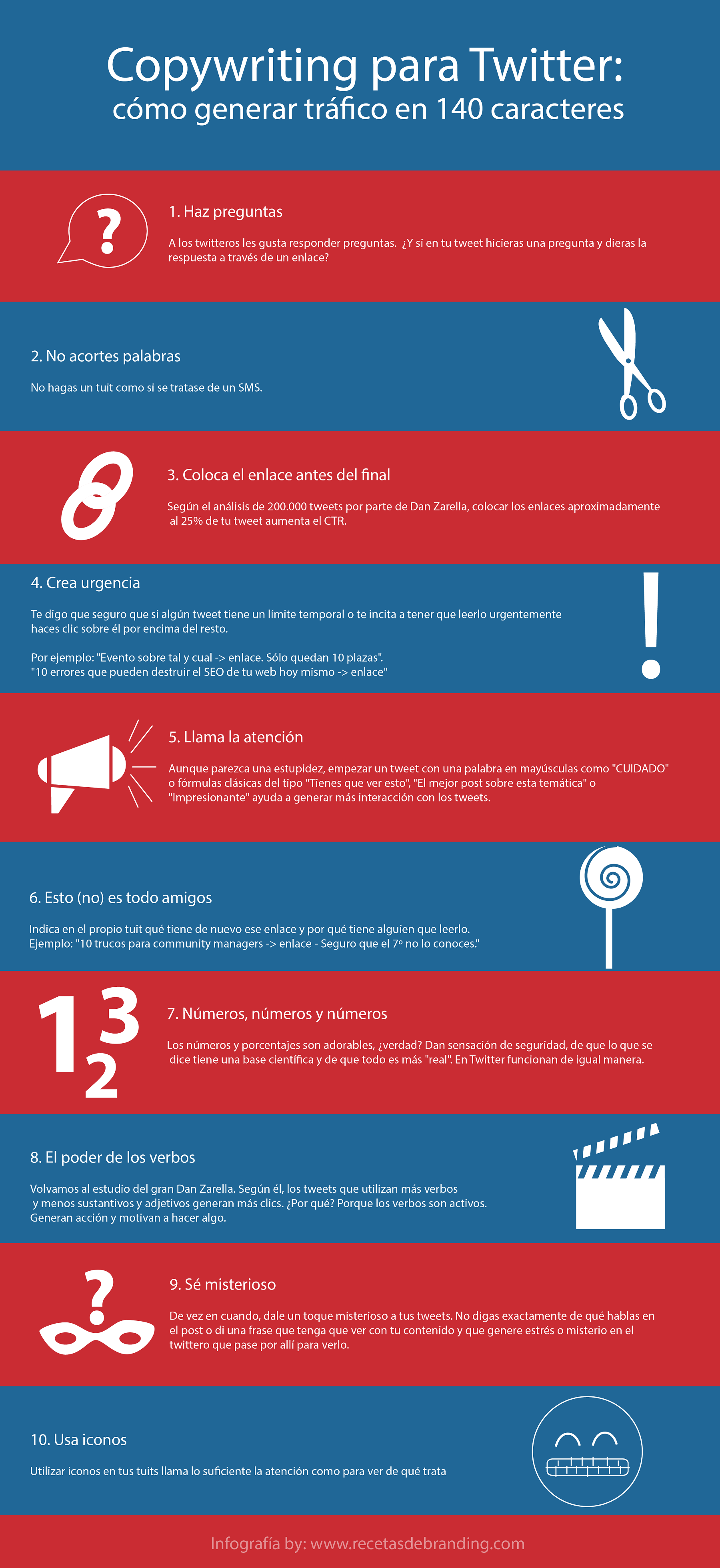 6. ¡Muy buenos consejos! La verdad es que muchas veces en Twitter cuesta ser original por eso de los 140 caracteres. Todo lo que se te ocurre y te gustaría poner, casi nunca cabe, así que al final acabas borrando palabras y el mensaje pierde gran parte de su sentido.