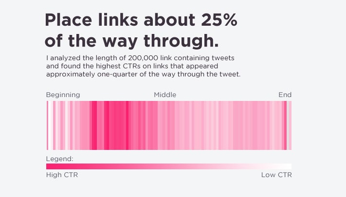 Según el análisis de 200.000 tweets por parte de Dan Zarella (uno de los jefazos en el tema de Social Media) colocar los enlaces aproximadamente al 25% de tu tweet aumenta el CTR. En el siguiente gráfico podréis ver que también hay un pequeño pico al final, pero que principalmente los enlaces con más clics son aquellos colocados al principio.
