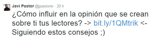 Si quieres comprobarlo, haz la prueba tú mismo. Coge todos tus tweets y cambia el clásico modelo "Titular - Enlace - hashtag" por "Entradilla - enlace - comentario - hashtag" y verás que tus resultados mejoran.