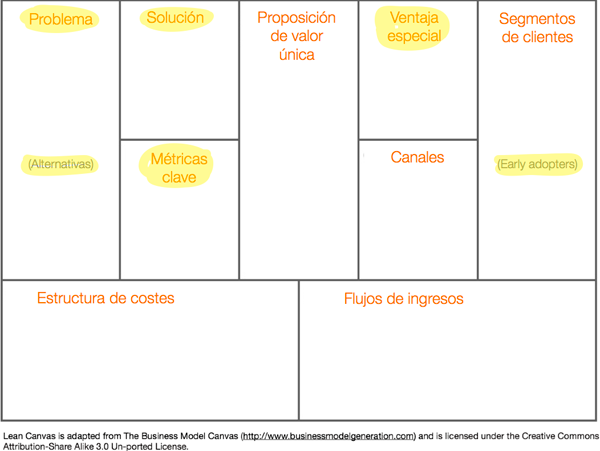 Lean Canvas es un sistema sencillo para analizar el modelo de negocio de una startup inspirado en el Business Model Canvas y adaptado para emprendedores con un alto índice de incertidumbre.